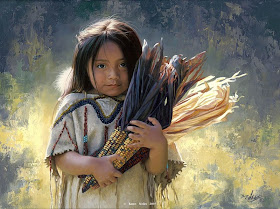 Noles dipinge questi bambini nei fondali colorati dello  stato del Montana in cui risiede.  I momenti intimi di innocenza Noles vernici sono veramente i tesori del patrimonio dei nativi americani.